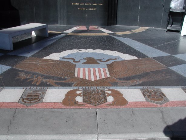 Die Statue , die Fahne und das Wappen sind am anfang des Dam’s.