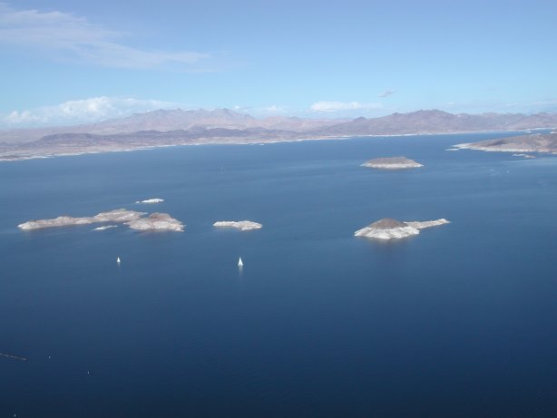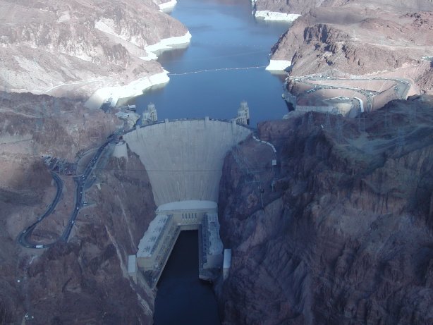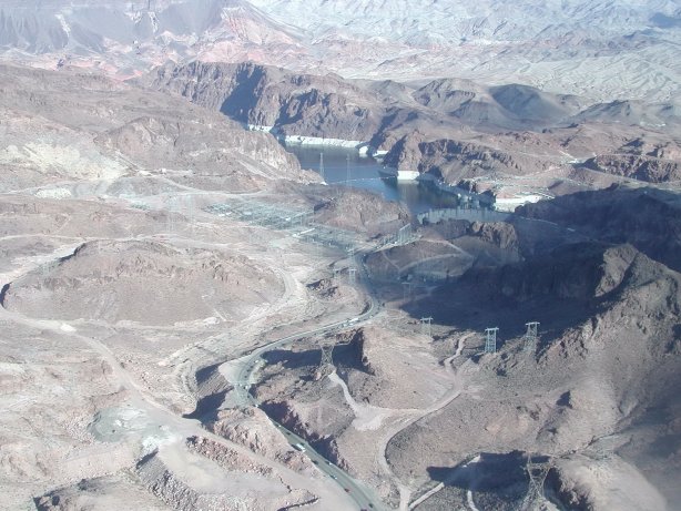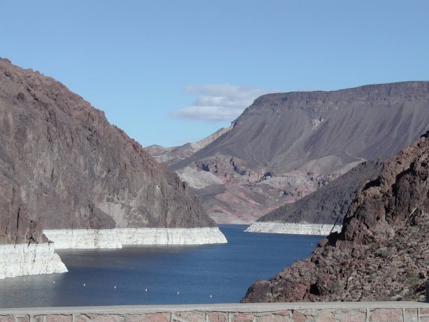 Der Stausee heist Lake Mead . Wie man an den Weisen Uferrändern sehen kann hat der See etwa 15 meter zu wenig Wasserstand.