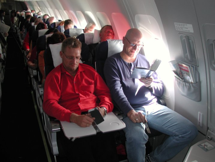 Beim Lesen. Durch das Vorabendeinchecken haben wir Superplätze (am Notausgang mit super Beinfreiheit).